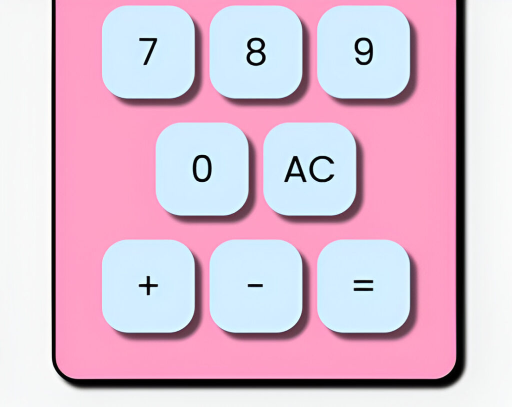 Diseño completo de una calculadora de estilo moderno con fondo rosa, botones numéricos y de operación celestes, y pantalla blanca, sobre un fondo gris claro